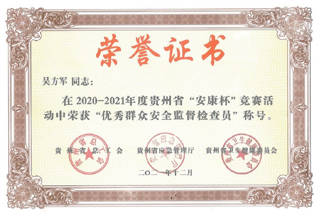 同時(shí),集團(tuán)公司吳方軍同志在該次評選中榮獲“貴州省優(yōu)秀群眾安全監(jiān)督檢查員”稱號(hào)。