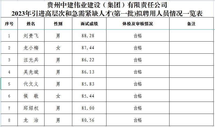 根據《貴州中建偉業(yè)建設(集團)有限責任公司高層次人才和急需緊缺人才引進工作方案》,經報名、資格審查、面試、體檢和考察等程序,劉貴飛等八位同志列入貴州中建偉業(yè)建設(集團)有限責任公司2023年引進高層次和急需緊缺人才(第一批)擬聘用對象(詳見附件),現(xiàn)予以公示。