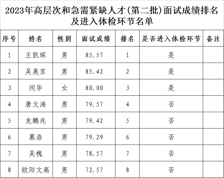 附件:2023年高層次和急需緊缺人才(第二批)面試成績(jī)排名及進(jìn)入體檢環(huán)節(jié)名單
